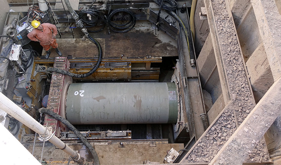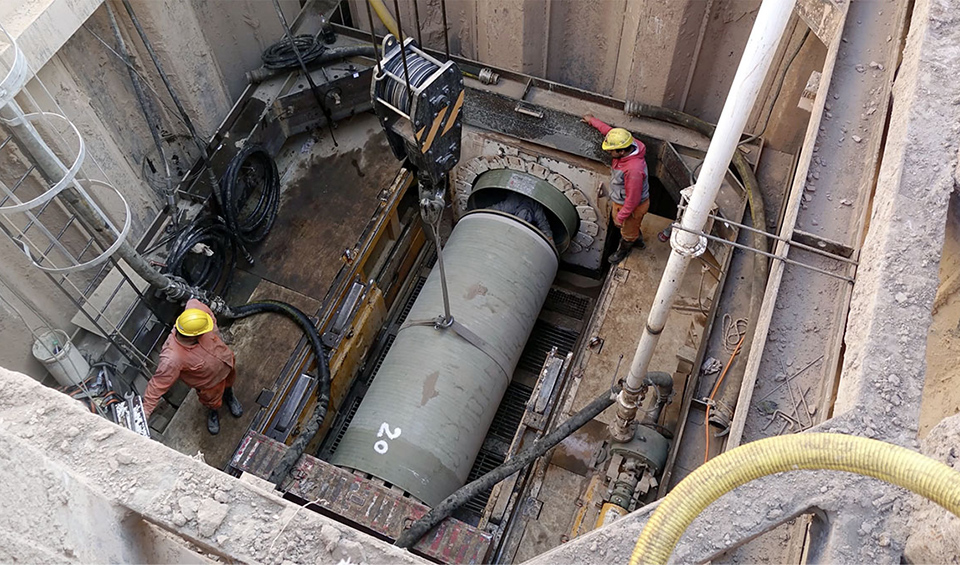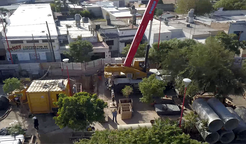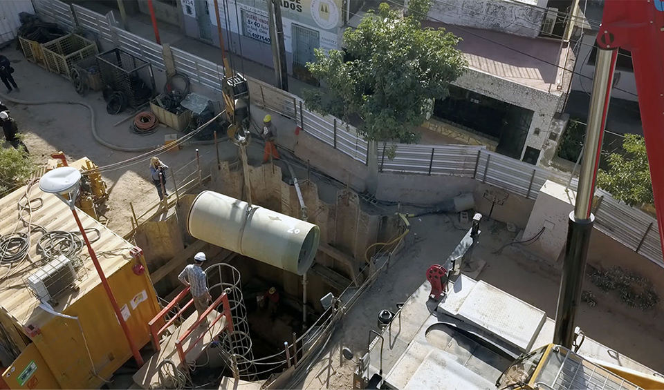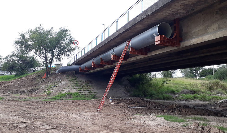 Cañería de impulsión de 10 km en diámetros 1400, 1300 y 1100, estaciones de bombeo, cruces bajo arroyos, rutas nacionales y vías FFCC.