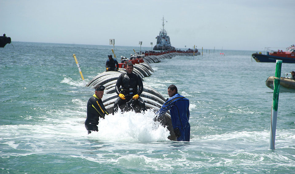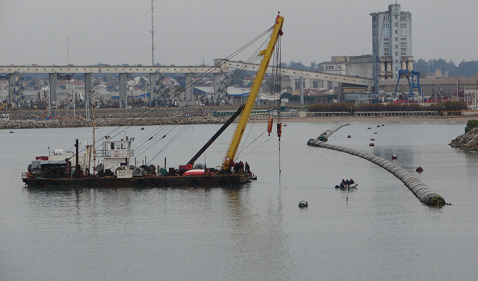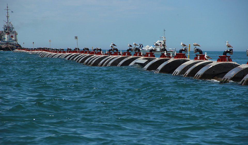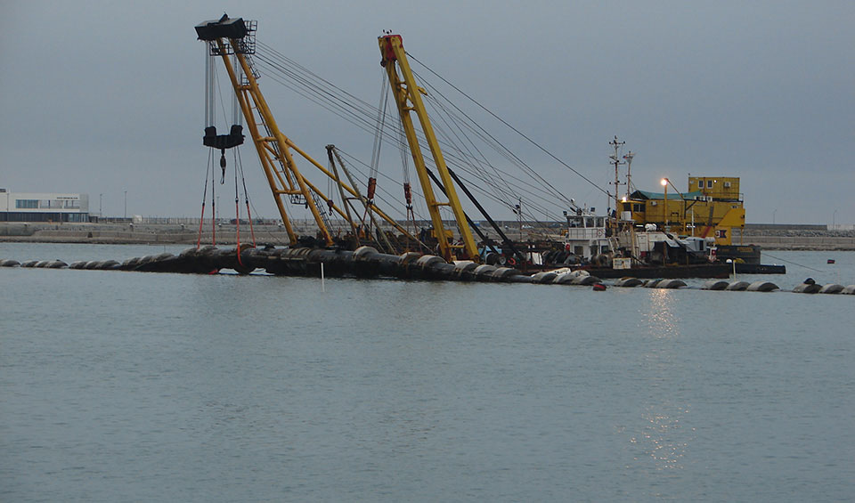 Cañería de PEAD Ø 2000 mm - 4.110 mts. Escollera: 450 ml (110.000 tn de Piedra – Coraza de 1,5tn a 7tn). Lastres de Hormigón Armado 620un de 18tn y 310un de 7tn. Estación de bombeo (6 bombas de 340kw), aliviadero, sistema de medición de caudales, bocas de descargas 89 de Ø 150 y una de Ø300 al final. Caudal de Diseño: 9 m3/s.