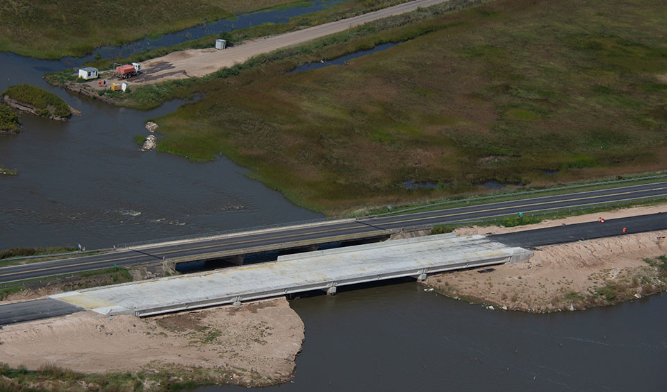 Construcción de obras básicas, pavimentos puentes (2) 30,00 mts. c/u y obras complementarias – Long. 45,50 Km. Construcción de 2 puentes con losas de aproximación y refuerzo de pilas y estribos y construcción de 2 puentes de 30,00 mts. Total 60 mts.